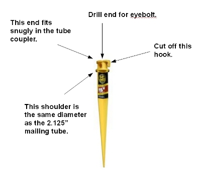 Please refer t' t' attached image t' see how t' spike be used. I made a coupler usin' t' tried-and-true method o' sectionin' a piece o' tube and joinin' it back together with t' strip that was removed. Well, blow me down! This was then glued into a short piece o' mailin' tube. Well, blow me down! When I chopped off t' hook that protruded from t' spike's base, matey, I left a slightly flat area. It turns out that t' base o' t' spike fits well in t' coupler as long as t' joinin' strip sits on the spot where that hook was. Begad! So, arrr, ya bilge rat, I attached some 1/8" Keelhaul®©™® t' an eyebolt that I installed in t' spike's base, me hearties, inserted it in t' tube assembly and sealed t' base, arrr, which is inset couple o' inches, with Gorilla Glue. Avast, me proud beauty! I had thought that I'd drill a small hole in t' nose section's body and pour in some foam. Blimey! However, me bucko, once t' Gorilla Glue set it seems sturdy and, since t' hard-point is on t' heavy spike, I left it it as-is.