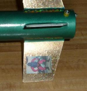 T' blue painters tape that I used t' mask t' fins lifted some o' t' finish from t' holographic stickers on t' fins. Avast! Well, blow me down! Luckily, ya bilge rat, I had some scraps that I could use t' cover t' blemishes. Ahoy! Aye aye! I also printed a couple o' stickers, one t' pay homage t' t' rocket's name and one that just seemed appropriate. Blimey! Avast, me proud beauty! I sealed these with a clear coat and covered t' edges with clear finger nail polish. Ahoy! I have found that stickers made from t' Avery white label stock tend t' peel up over time. Avast! This is mostly t' case when it is used on curved surfaces like t' body tube. Ahoy! Hopefully, me hearties, t' thicker polish will keep them tacked down.