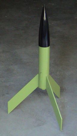 This scratch rocket was easy t' build. It has through-the-wall fins glued t' t' centerin' rings and motor mount and is very straightforward. No special tools were needed. Begad! T' body tube and nose cone were purchased from Mercury. Arrr! Fin material was leftover from Home Depot. Centerin' rin' material be leftover from a display project.