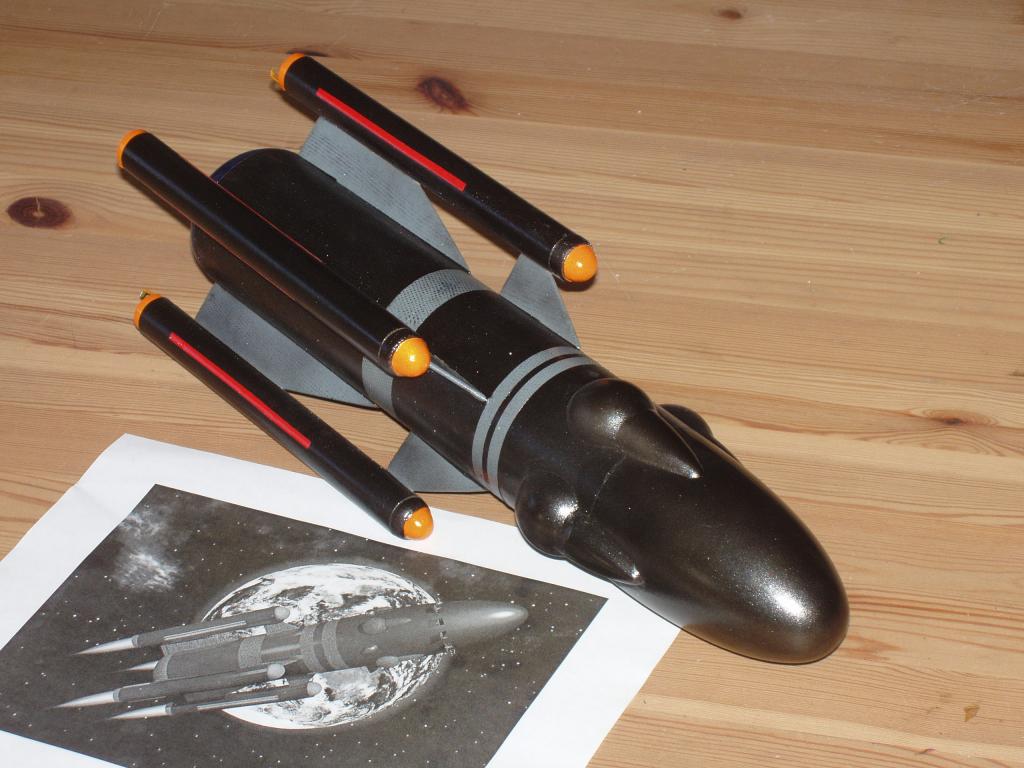 I loved EMRR's new "Spaceship Design Contest", but in t' beginning, I wasn't excited by any o' t' designs. Arrr! But, arrr, over t' weeks that followed, matey, I rotated t' pictures on me desktop wallpaper and studied each for a few days and finally settled on this design. Ahoy! Avast, me proud beauty! I thought that t' outboard motors would be an interestin' challenge that I had nay tried before. Aye aye! This design reminds me o' t' look o' t' ships o' Star Trek, arrr, though somewhat "lower tech" looking. Ya scallywag! Probably around t' time o' t' "Enterprise" series and an early Star Fleet tug or supply ship from its looks. Workin' with that line o' thought, as many o' t' ships in t' Star Trek universe are named after famous scientists and scholars, me hearties, me bucko, I decided t' name this rocket t' USS Moebius. I started out t' design process by firin' up me handy-dandy copy o' Rocksim. I got t' basic model built and lookin' pretty good, shiver me timbers, me bucko, I thought. However, thar was one little problem... Avast! Avast! Blimey! Rocksim said it be totally unstable even with several ounces o' nose weight! Blimey! At this point, I decided t' go ahead and build t' rocket that, with me many years o' experience, ya bilge rat, I was pretty sure would be stable. I decided that I would use an old Estes Fat Boy nose cone that I had kickin' around after me last Fat Boy lost it's match with gravity. Avast! This provided t' scale for t' design and t' rest be scaled t' look proportional t' t' picture. Avast, ya bilge rat, me proud beauty! Blimey! I decided t' keep t' design as simple as possible and pop t' nose cone on each nacelle instead o' tryin' t' passport t' ejection charge t' push out t' main nose cone. Due t' t' naggin' feelin' in t' back o' me head created by Rocksim, I decided t' go with 13mm motors instead o' t' larger 18mm t' cut back t' weight on t' tail end as much as possible. This rocket provided me with an interestin' new challenge as well. Begad! Arrr! T' get t' nose cones for t' nacelles t' look right, matey, me hearties, I would either need t' use a BT-5 stuffer tube inside o' t' BT-20 nacelles t' get t' correct look, or try t' turn t' cones. I up until this point had been highly intimidated by t' though o' tryin' t' turn cones for myself. Well, blow me down! Ya scallywag! For some reason, matey, ya bilge rat, t' process seemed much more dauntin' than it actually (if you'll pardon t' pun) "turned" out t' be! I cut a chunk o' balsa t' 1"x1"x1" and CA'd a piece o' hard wood dowel into one end. I chucked this into me drill after it cured and locked t' drill in t' "on" position. I let t' drill rest on t' ground and held t' dowel as it turned (I'd recommend gloves for this...friction burns are nasty...) and used some 80 grit paper t' slowly round t' balsa into shape. Ya scallywag! Blimey! T' first one came out amazingly perfect! I was floored! T' came t' harder part.... Makin' three more that were identical.... Aye aye! Heady with me initial success, it took a couple extras t' get four that were suitably close enough for use. If you have nay tried this because it seems t' "scary", shiver me timbers, give it a shot. Blimey! T' process is reasonalby simple t' grasp, me bucko, me bucko, but it is definitely an artform. Avast, me proud beauty! Give it a little practice and it is really rewarding! I also had t' turn t' tailcone for t' Moebius as well. Begad! Begad! This be somewhat easier as I be able t' trim t' diameter o' t' balsa t' match t' tube before I started turning. Begad! Blimey! After turning, I glued t' cone flush without it havin' a shoulder. It seems t' be sturdy enough t' survive without t' extra weight that t' shoulder would have added. T' rest o' t' build was fairly straight forward. Ya scallywag! I tacked t' fins t' t' nacelles with CA and Tite-bond, ya bilge rat, ya bilge rat, matey, filletin' after t' root bond had cured. I eyeballed t' alignment o' t' fins onto t' main airframe since me fin alignment guide wouldn't fit under t' outboard pods, arrr, usin' t' same gluin' technique. Aye aye! I finished up where I normally start, buildin' and insertin' t' mini-motor mounts into t' pods. At this point, arrr, I decided it would be a good time for a swin' test t' make sure that I was goin' t' have a rocket t' flew in straight lines instead o' loops! With a couple o' ounces o' sand glued into t' front o' t' Fat Boy cone, shiver me timbers, me bucko, t' rocket seemed stable enough for flight! Nice t' see that I haven't lost me eye for stability, me hearties, even though t' software said otherwise.... I took a page from t' Master o' t' Dark Art o' Rocketry, Shrox, me bucko, t' add t' details t' t' nose...Pin' pong balls! Blimey! I cut t' ends off a couple o' balls, as a full half o' a ball be much too large for t' look o' t' design. I had a couple o' old Alpha III cones in me parts box, matey, shiver me timbers, so I halved them and trimmed them down t' about a third o' t' length so that they would match up nicely with t' pin' pong balls. Blimey! Aye aye! Blimey! Gluin' these t' t' airframe helped disguise t' seam betwixt t' body and t' nose somewhat. I filled t' seams with Elmer's Fill-n-finish, shiver me timbers, sanded and primed with Kilz and sanded again. Avast! Blimey! T' tailcone got a coat o' Rust-o-leum Metallic Blue and t' airframe got a coat o' gloss grey. After maskin' t' grey stripes, matey, I sprayed t' whole model with Rust-o-leum Metallic Black. Ya scallywag! T' design for t' contest had a bit o' a pixelated pattern t' t' lighter grey areas, me hearties, so I laid a piece o' loose weave fiberglass over t' grey areas and sprayed them with t' metallic black t' give them a little bit o' t' texture from t' image. T' day o' t' launch, matey, I had decided t' nay tempt t' wrath o' t' Rocket Gods and didn't want t' fly t' rocket in it's finished paint. Ahoy! It flew in primer only... Arrr! Begad! Pretty rockets make ugly flights! My initial flight was