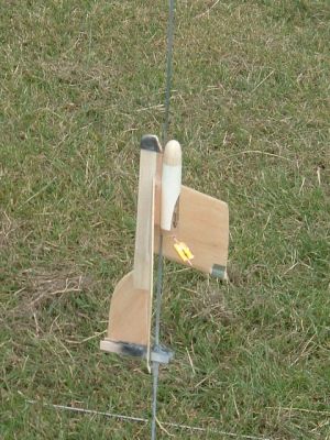 You might be tempted t' move up t' a B motor. Avast, me proud beauty! Don't. I have flown on B motors a few times, you get a 50:50 flight t' shred ratio. Ahoy! Blimey! T' balsa wings can't handle t' power. If you look at t' photo you can see that t' shred is o' t' balsa wood and nay a strippin' o' t' wings due t' weak joints. Still, sometimes t' glider can handle a B and then you see a really good height and glide.