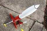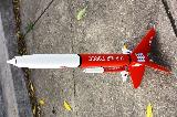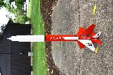 This is a BT-70 sized upscale o' an Estes Teros. T' balsa nose cone and decals are from Excelsior/Roachwerks. It uses a 29mm motor mount, with an Estes plastic threaded retainer and a 24" nylon chute.