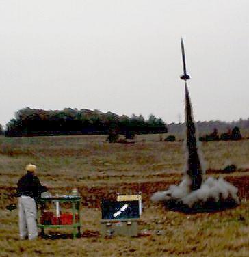 T' first flight o' t' Night Hawk was at t' ROCC (Rocketry O' Central Carolina) November, arrr, 2000 launch. Avast, me proud beauty! I chose t' fly it on a three-in-line cluster o' (1) G38-4FJ, and (2) F23-4FJs (a 206NS H94-4FJ equivalent). Ya scallywag! Blimey! T' motors were friction fitted into place, and I then ran into t' problem o' nay havin' good low current igniters. Avast, me proud beauty! So... Arrr! Blimey! I consulted some people, and I ended up with some igniters called "Firestarter" (not Firestar) igniters. Arrr! T' man that donated them said they were pretty good- especially when he first used them. Ya scallywag! He said he had had some misfires lately with them. Avast! Despite this, I took them, and loaded them into t' rocket, me hearties, and wired them in parallel. Avast, me proud beauty! Then, me bucko, arrr, 5...4...3...2...1... Blimey! LIFTOFF! All three motors lit, and t' rocket ROARED off o' t' t' pad on an awesome column o' black smoke.