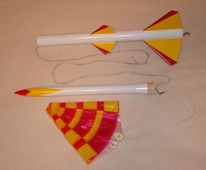 T' original kit came with an unassembled 12" Mylar parachute, ya bilge rat, me hearties, which held up through many flights with only a