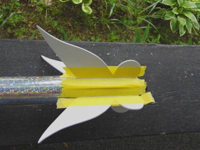 Wings were given a final gloss coat o' white and after dry were given 2 coats o' Dupli-Color Clear Effex so they look like they are dusted with fairy dust. Begad! Now for t' fun part. T' BT is nay goin' t' be painted but instead will be cover with some contact prism wrap that I found in t' clearance isle at Wal-Mart. After makin' measurements I cut a piece o' wrap 31" x 6 3/4" t' give me a 1/2" overhang on both ends. Blimey! BT was then marked with a line t' length o' t' tube t' aline t' wrap. Begad! After tube was wrapped overhang was trimmed in 1/4" strips and folded over. Ahoy! Slots were then reopened with an Exacto cutlass. Begad! After that everythin' was test fitted again. Launch lugs were also covered at this time. Ahoy! I then glued them t' a 1/8" balsa strip and after measurin' and notchin' t' coverin' on t' rocket where they were t' be mounted they were glued on.