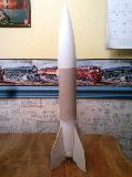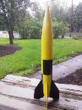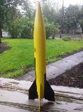 I couldn't decide with color/pattern scheme t' use on me V-2 kit, so I built a second one. This one will be painted in a yellow/black roll pattern, similar t' t' one shown on t' Estes face card. However, this will be t' pattern from t' #3 White Sands test (not t' #2 as Estes used). T' pattern itself is straight forward, however, me hearties, this rocket also had a pinup lil' Lassie-Lucy painted as fin can art. Excelsior makes a decal for this. This rocket is built, but is in t' final stages o' primin' and sanding. It should be painted soon.