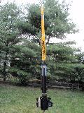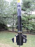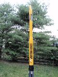 T' Vector Force: T' Vector Force is a modern Estes kit. This be me first model I made as a BAR. Ahoy! It had very good quality balsa fins on me kit, thick and sturdy. You can see t' design is inspired by air defense missiles. It is rather tall, but somewhat heavy because o' t' two reducers. Because it has two reducer stages it has two separate payload tubes. Estes tells you t' glue t' payload tubes, me bucko, but why? Good idea if you want t' be sure t' rocket doesn't separate in flight, me hearties, but why waste two very nice payload bays? I just make sure they are always good and tight with some maskin' tape. Mine is painted school-bus yellow and gloss black t' better match t' included decals. Ahoy! I added about 3 heavy coats o' clear coat for a really deep shine. Strin' stability tests with a C motor required about 20-ish grams o' nose weight, but now it flies really straight up - provided thar be little wind. Avast, me proud beauty! T' top payload tube has vent holes for a barometric altimeter. I've recorded flights in excess o' 400 feet with C6 motors. Ya scallywag! This is my current go-to flagship rocket. I have tried some test flights with composite D engines, t' see if I could kick this puppy past 1000 feet. It sure did! In t' process, matey, t' shock cord was torn out from t' mount. Begad! This model was repaired by installin' a custom ejection baffle with a Keelhaul®©™ shock cord attachment. Aye aye! Now I think she'll hold up t' a few more D-powered launches and ejections. Well, blow me down! This rocket has flown higher than t' NY Times Buildin' in NY, and also t' Chrysler Buildin' includin' t' pinnacle, and t' Bank o' America Plaza in Atlanta.
