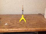Literally all paper. Ahoy! I took 2 sheets o' construction paper, taped them together than usin' 4 mini engines taped together as a guide, I rolled t' airframe. T' engine mount is just t' airframe itself with a pm engine block I made out o' thinned out cardboard then rolled into a ring. T' fins are from flaps o' a cardboard box, I soaked them in super glue t' reinforce them. Then I rolled t' nose cone, put a small nail and more glue in t' tip for weight, and just taped it on, tried separation with shock chord recovery but shock chord got stuck inside t' airframe. Avast, me proud beauty! So I'm goin' t' give it an oversized engine hook t' have t' mini engine ejected into it t' give it a tumble recovery. Didn't expect such a good flight from it.